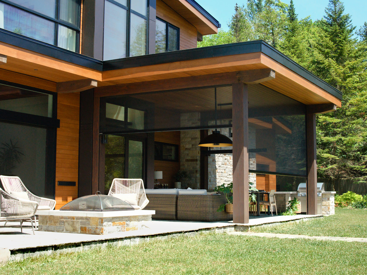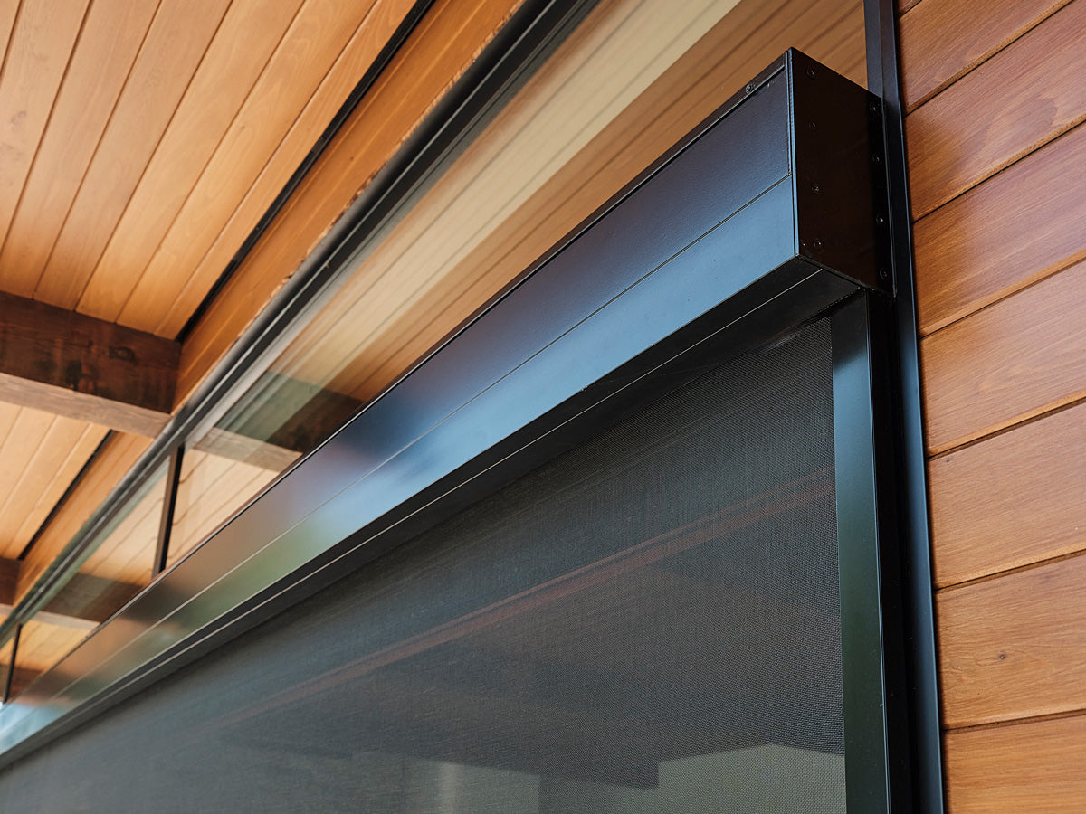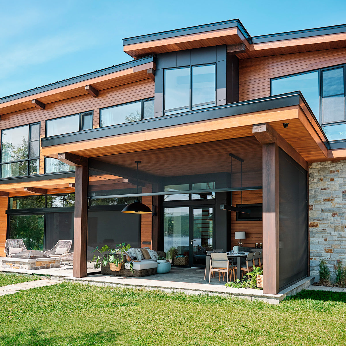 Nestled along the edge of the lake, this home was envisioned as a serene retreat, where nature is experienced at all times. To preserve that tranquility while offering protection from the realities of lakeside living — mosquitoes, passing showers, and the midday sun — motorized screens were seamlessly built into the walls and columns. Hidden when not in use, they provide discreet comfort without ever disturbing the view or the property’s elegance.