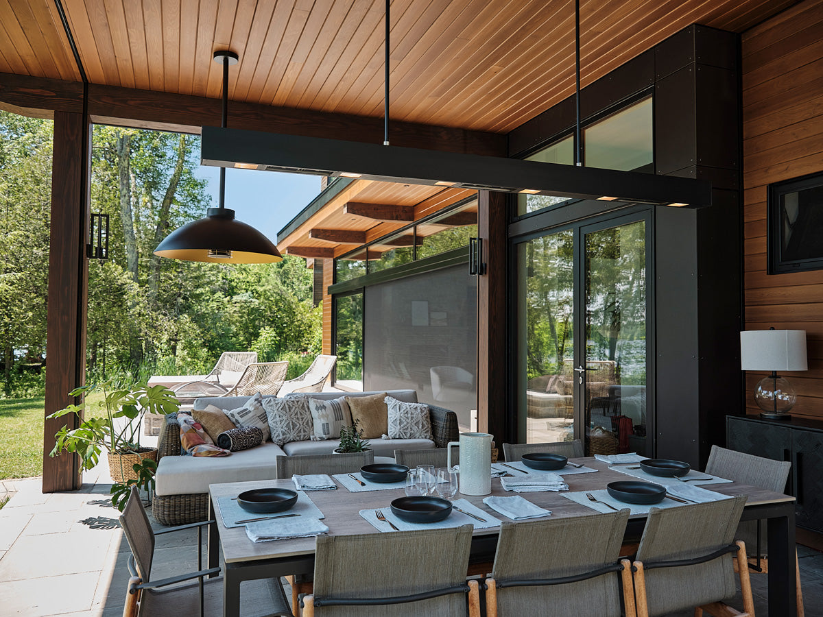To preserve the timeless character of the setting, an integrated lighting fixture was chosen with care, soft, warm, and perfectly in tune with the home’s relaxed, yet elegant aesthetic. Evenings feel effortless, whether spent dining beneath the wood-lined canopy or listening to the calming sound of the water just steps away. Protected from bugs and weather, the space offers the best of both worlds: open-air living, wrapped in quiet comfort.
