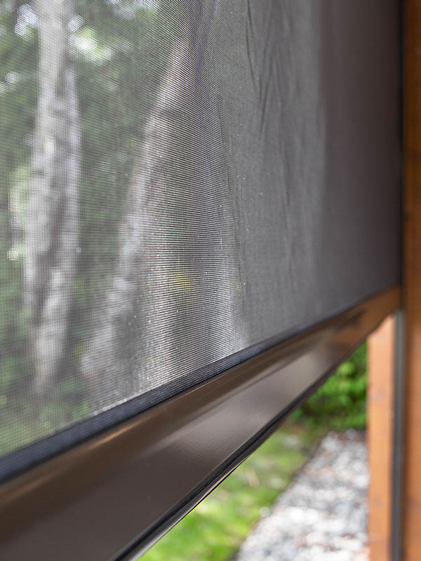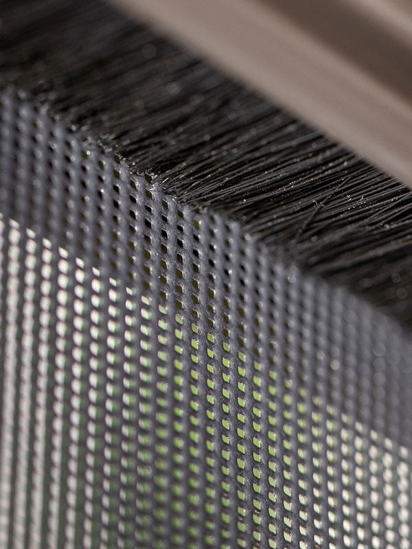The aluminum frame's design allows the fabric to be easily adjusted and kept taut over time. A rubber gasket is fixed to the tension bar system, providing a sealed closure. The system is inserted into side slides using a zipper mechanism that provides a lateral seal against insects. To maintain your screen or sunshade clean of insects or debris, we’ve incorporated a brush along the top casing.
